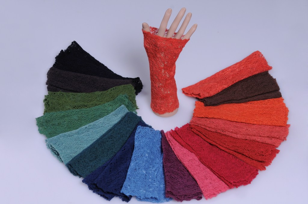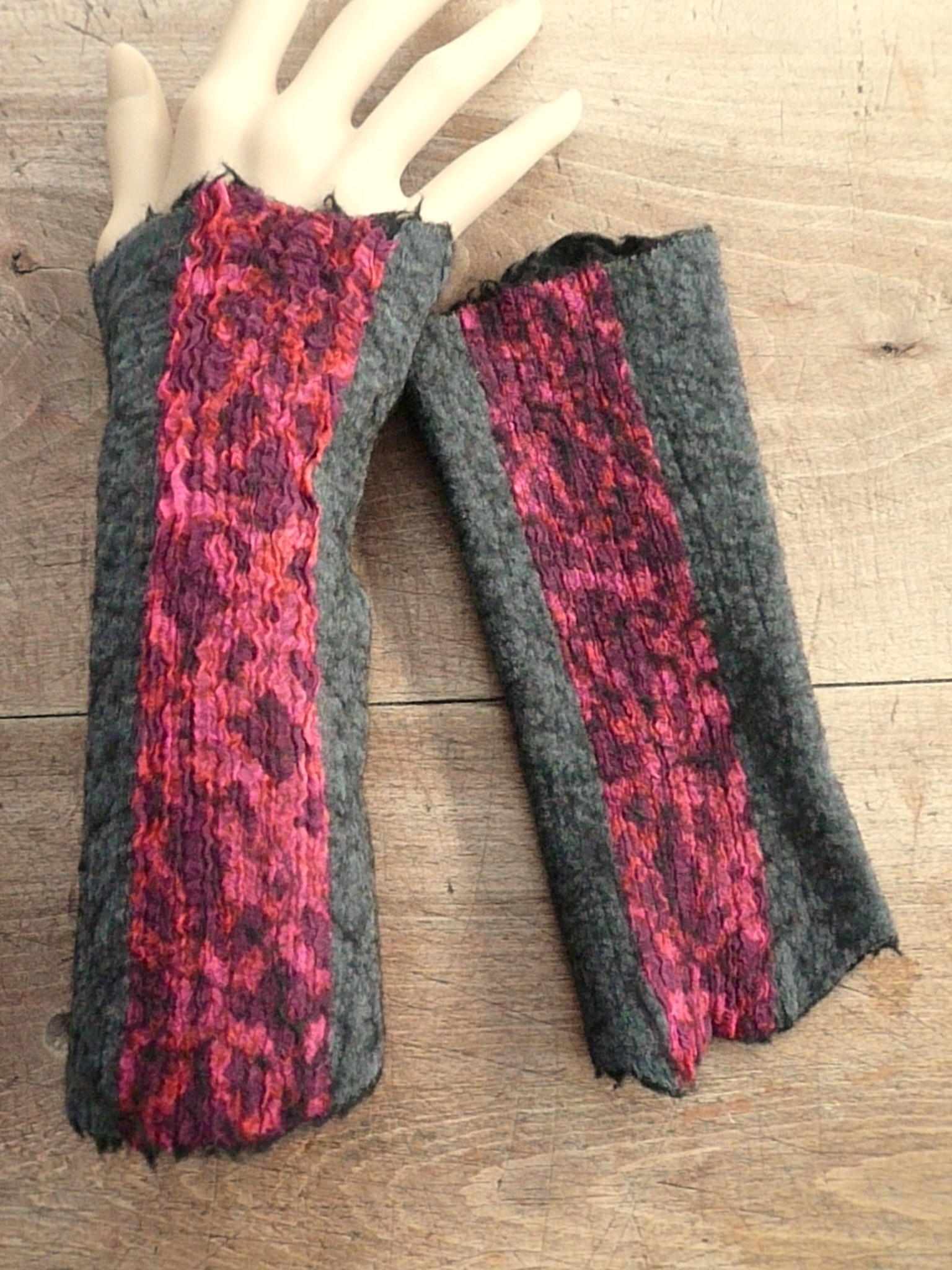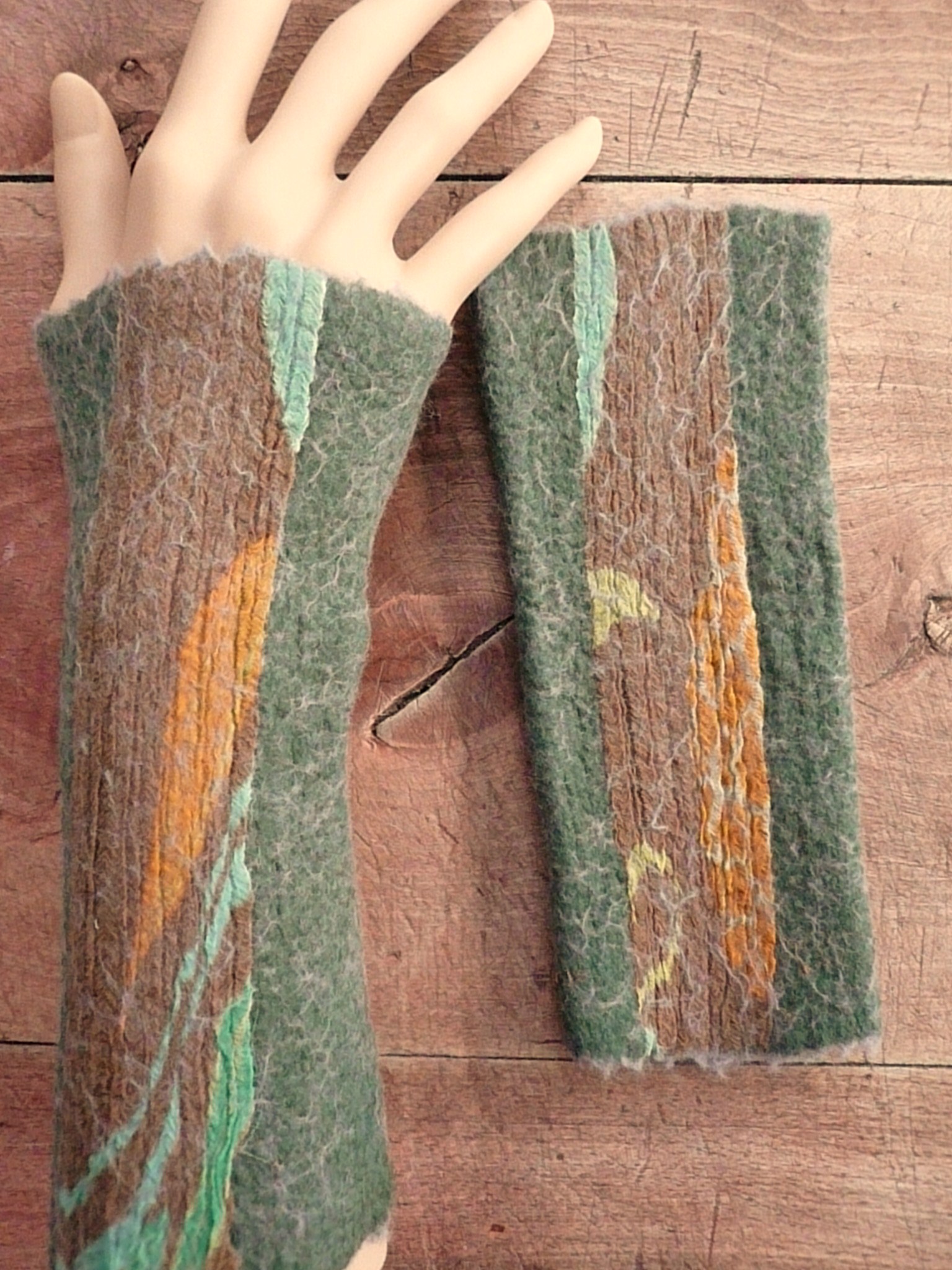 Die Stulpen werden aus reiner Wolle und Seidenchiffon elastisch gefilzt. Dadurch schmiegen sie sich angenehm an Arm und Hand an. Außerdem lassen sie sich umstülpen und inside out tragen.